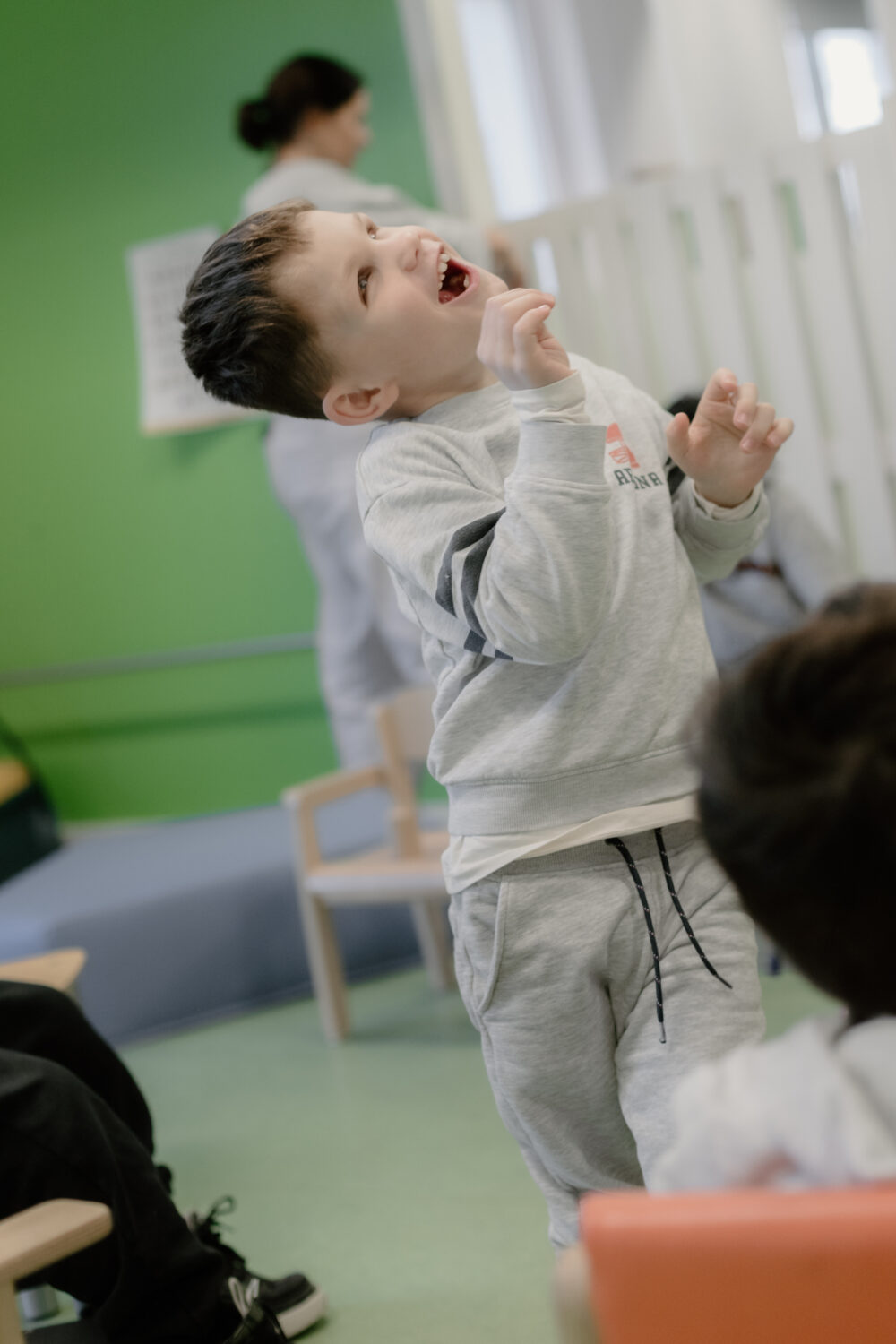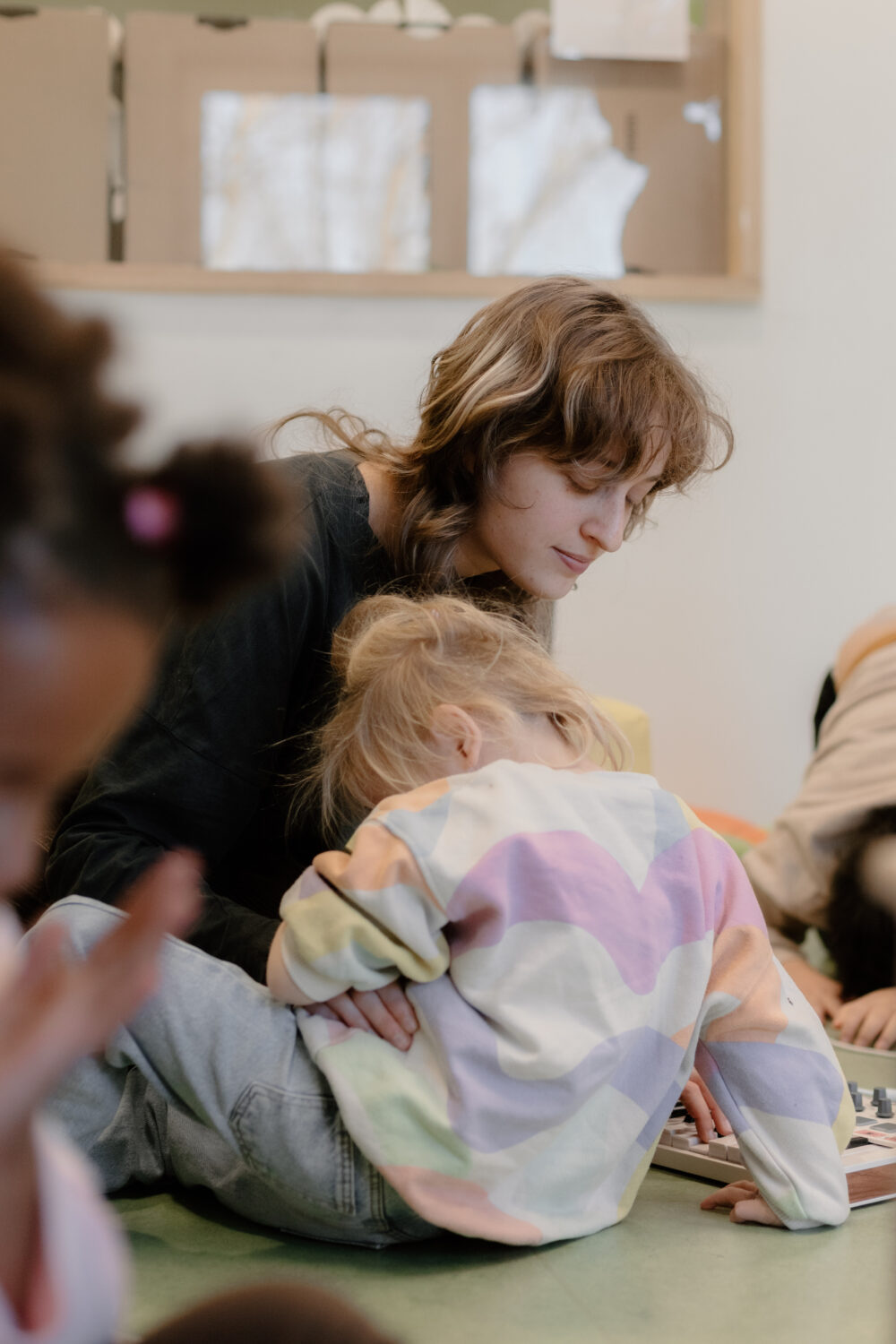 We Zoë stelden gerust: het is oké als bepaalde kinderen niet meteen meedoen of plots weggaan. Door aanwezig te zijn in de ruimte zijn ze op hun manier betrokken.