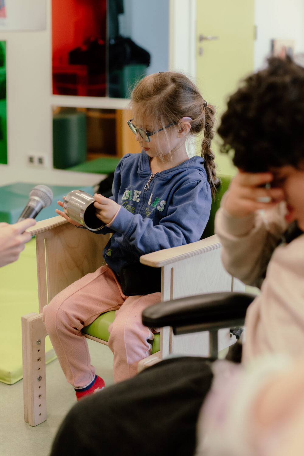 Hoe een vervolg er zou kunnen uitzien, vraag ik. Hilde: “Muziek is en blijft toch een belangrijk medium om met onze kindjes aan de slag te gaan. Het werkt verbindend. Het ene kind wiebelt, het andere danst, nog een ander luistert in stilte mee, maar allemaal genieten ze op hun manier. Ook het tactiele aspect is belangrijk: kinderen moeten dingen kunnen aanraken.”