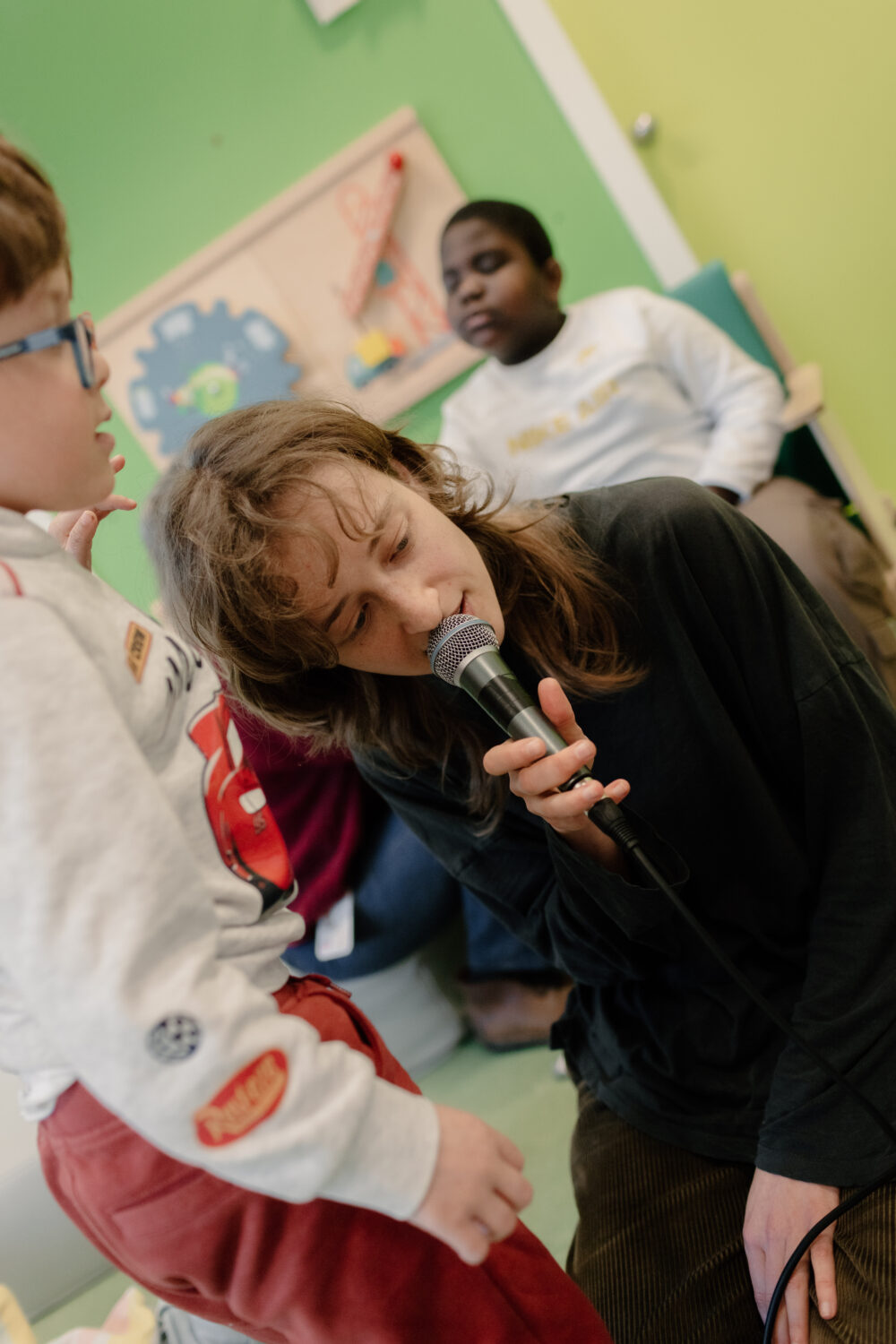 Katrien haalt haar smartphone boven en toont een filmpje van een van de ateliers. Zoë zit bij de kinderen op de grond. Met haar warme zachte stem zingt ze op geluiden die ze tijdens een vorig atelier opnam. Ze vocaliseert de namen van ieder kind. Dat mist haar effect niet.