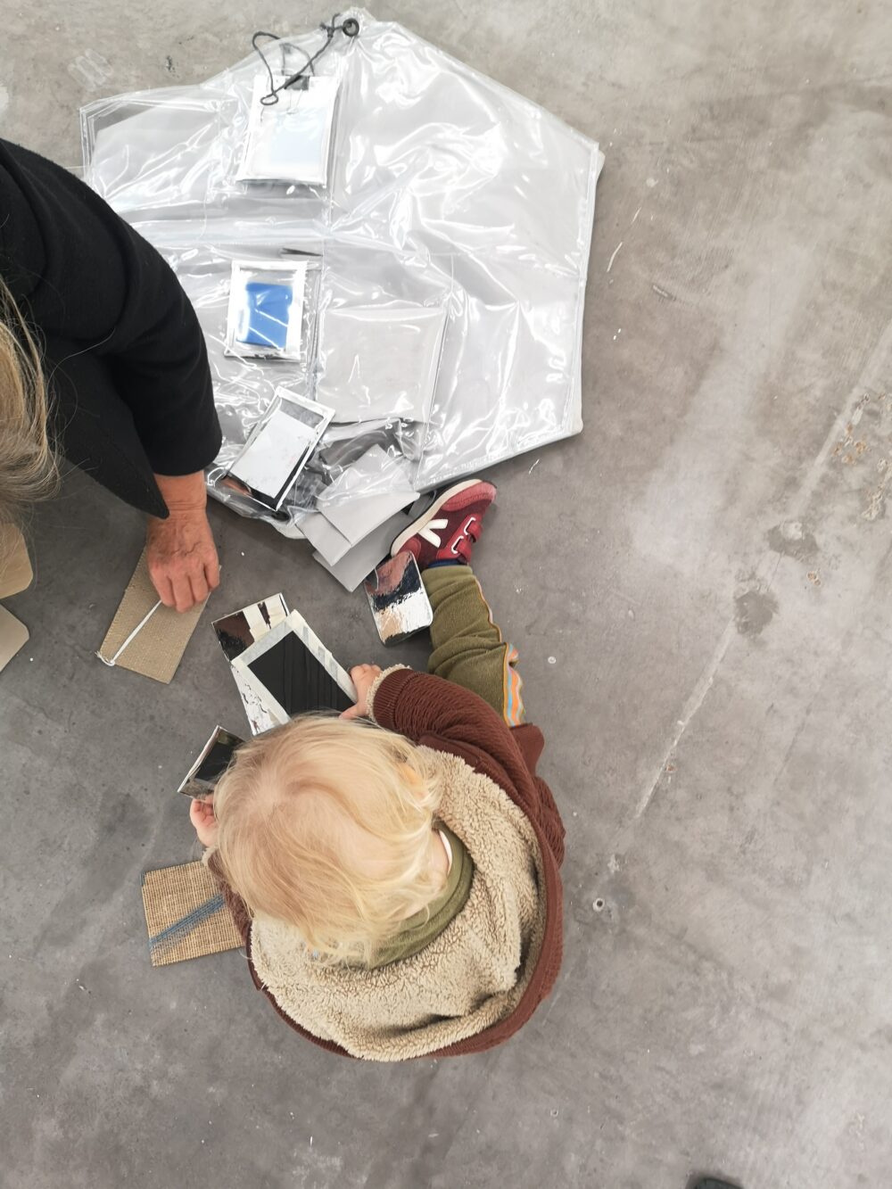 WIELS has a long tradition of working with the very youngest. For a number of years, there were 'May babies', weekends in May when special guided tours and workshops were organised for families with younger children. Due to the intensity of this, it was decided to experiment with a different approach that also included a direct and permanent link with current exhibitions. The Baby Bags came about in a similar way: they were developed over a number of years and then integrated into the regular programme. Baby Bags are a kind of bag/blanket/cushion that parents of children aged 10 months and older can take with them during an individual visit to one of the exhibitions. They were designed by artists Lucie Burton and Nathalie Arnaud and contain objects that stimulate the senses (a piece of string, a musical instrument, a stick of liquorice, etc.). The contents vary depending on the exhibition. Baby Bags are available free of charge and help children explore the exhibition in a different way.