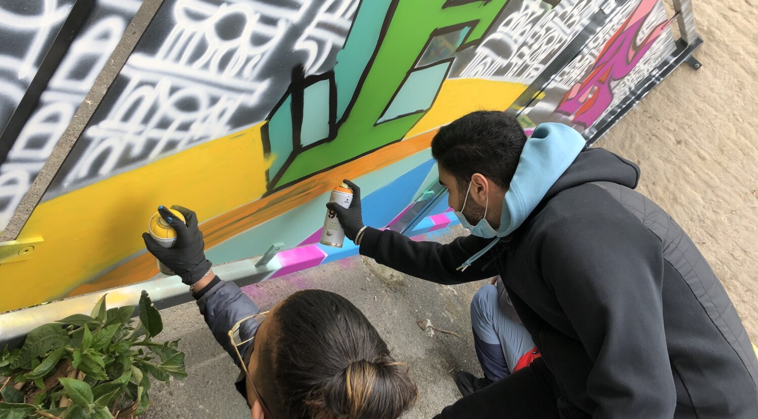 This is how a graffiti workshop by visual artist Régis Bour, assisted at the school by Julie Lemenu, began. The assignment: to create a mural designed by the pupils for the new CEFA classrooms. During the first workshop, the students were still quite reserved, but as the sessions progressed, students from the Electricity and Sales departments also joined in. Together, they began to work on the first sketches. They then tried out the effect of spray cans on wooden boards. In this way, they prepared for the final mural. Régis and Julie complemented each other perfectly: both have a passion for graffiti, for the technique and the philosophy behind the movement. One took care of the artistic interpretation and the necessary preparations, while the other supported the process and maintained contact with the school and the students (e.g. for practical or logistical questions).